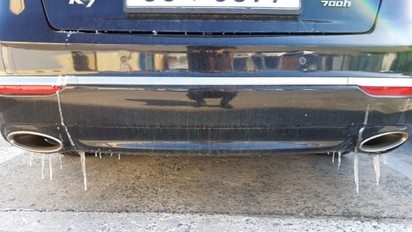 ↑↑ 자동차 뒤범퍼에 작은 고드름이 주렁주렁 달렸다.