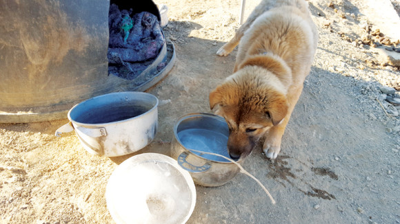 ↑↑ 개 밥그릇에 담아둔 물과 개밥이 꽁꽁 얼어 붙었다.