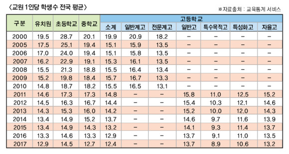 교원 1인당 학생수는 한사람의 교사가 얼마나 많은 수의 학생을 대면하고 있는지를 보여주는 것으로 학급당 학생수와 함께 교육여건을 가늠하는 중요한 지표가 되는 것이다.