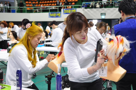 ↑↑ 영천에서 열린 미용경기대회 참가자들이 경기에 열중하고 있다.