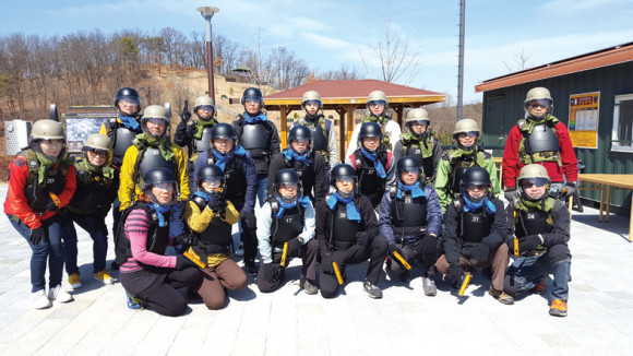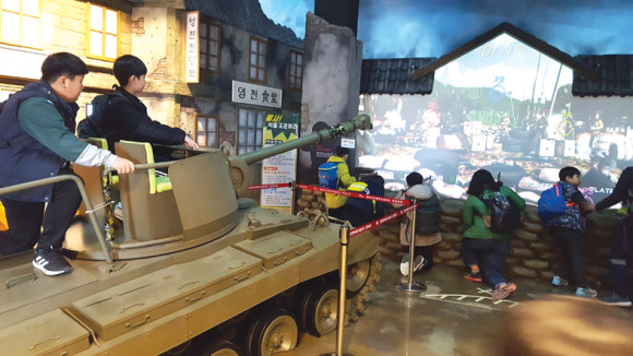 영천메모리얼파크 전망타워내 전쟁 체험하는 몰에는 봄을 맞아 학생들의 발길이 끊이질 않고 있다. 지난 17일 오전 외지에서 온 학생들이 영천전투 전쟁 체험하는 놀이(게임)에 몰두하고 있다.