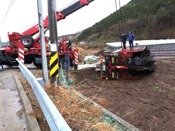 지난 6일 오전 괴연동 용수골 못 부근에서 눈 피해로 무너짐 비가림시설을 철골조를 치우던 대형차가 포도밭에 들어가 작업하던 중 뒷바퀴가 빠지자 옆으로 넘어졌다.