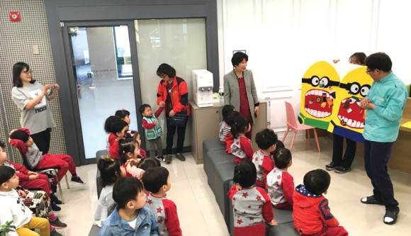 아름어린이집 원생들이 지난달 29일 야사동 닥터스치과병원을 방문하고 치과병원 체험과 구강보건교육 무료검진 등을 했다. 이들 두 기관은 업무협약을 맺고 정기적인 교육을 실시하고 있다.