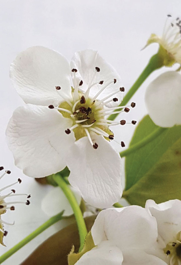 동해 입은 배꽃 모습이 사진에 담겼다. 가운데 암술이 동해를 입어 까맣게 말랐다. 동해 예방책은 개화전 충분한 관수가 피해를 최소화 할 수 있는 방법이다.