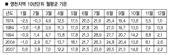 이렇듯 지역 작물의 변화에는 기온이 가장 큰 영향을 주고 있다. 영천지역의 기온변화를 살펴보면 연평균 기온은 조금씩 올라가는 것을 확인할 수 있고 작물의 월동기인 겨울철(11월~2월까지) 기온이 눈에 띄게 상승하는 것을 알 수 있다.<도표참조>