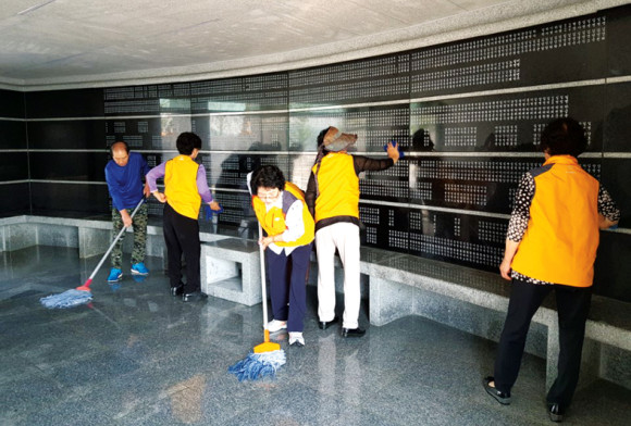 대한민국 전몰군경유족회 영천시지회(회장 장팔봉) 회원 20여명은 지난 2일 제63회 현충일 행사를 앞두고 충혼탑 봉안당 및 주변 환경 정비에 구슬땀을 흘렸다. 회원들은 “환하게 웃으며 시간 가는 줄도 모르게 열중하였으며, 모두가 내부모 위패를 닦는데 당연한 일 아니냐며 시종일관 화기애애하게 했다.”고 했다.