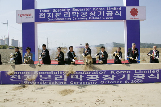 경북도가 심혈을 기울여 유치한 엑손모빌사의 첨단 리튬이온전지 분리막 구미공장 기공식 9일 구미 4공단에서 열렸다.