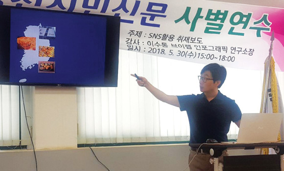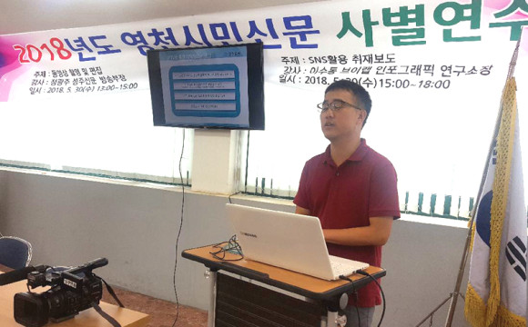 이날 연수 프로그램은 성주신문 정광주 방송부장의 ‘동영상 촬영 및 편집’과 브이랩 인포그래픽 연구소 이수동 소장의 ‘SNS를 활용한 취재보도’로 강의가 각각 이어졌다.