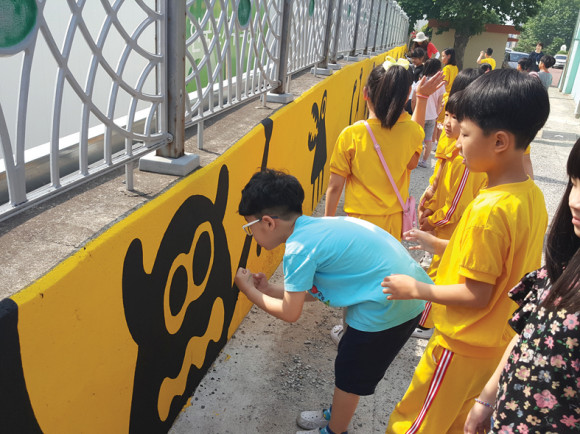 ↑↑ 중앙초 재학생이 벽화를 보며 즐거워하고 있다.