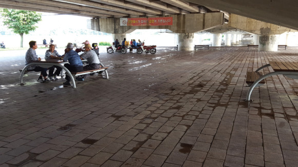 지난 6일 영동교 밑 쉼터에서 대대적인 청소가 실시됐다. 둔치 관리하는 담당자들의 청소활동은 오전에 시작, 물을 이용해 바닥을 깨끗하게 청소했다. 건너편(완산동) 쉼터도 마찬가지로 깨끗하게 청소됐다.