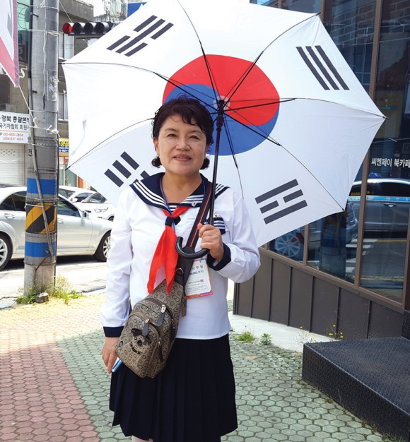 태극기 우산과 추억의 교복을 입은 한 시민이 선거운동원으로 다니며 후보자(교육감 후보)를 홍보하고 있다. 이색적인 홍보 활동으로 지나는 시민들의 눈길을 끌었는데, 시민들은 “태극기 우산이 참신한 아이디어로 보인다.”고 입을 모았다.