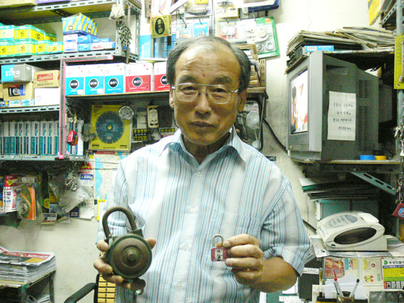 | | | ↑↑ ▲ 과거에 사용하던 대형자물쇠와 소형자물쇠를 보여주는 노재목씨. | | ⓒ 영천시민뉴스 | |