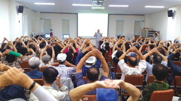 ↑↑ 노인대학에서 역사문화박물관 지봉스님의 특강에 참가한 어르신들이 한방체조를 하고 있다.