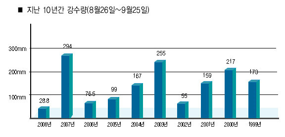 이는 지난 10년(2008년~1999년)의 평균 강수량 152mm와 비교하면 19% 수준에 불과하다.