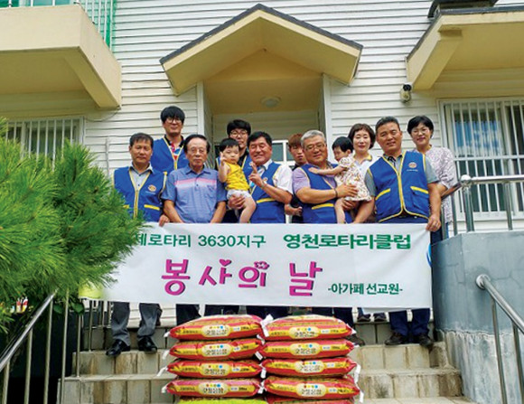 | | | ⓒ 영천시민뉴스 | | 영천로타리클럽(회장 손병호)은 지난달 25일 아가페선교타운(화산면 소재)을 방문해 봉사활동을 펼치고 백미 200kg과 아이들이 좋아하는 햄버거 등을 전달했다. 회원들은 평소 청소하기 힘든 구석구석의 먼지를 깨끗이 청소했으며 앞으로 매월 정기적으로 방문해 봉사활동을 펼치기로 했다.