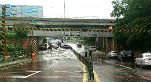 | | | ⓒ 영천시민뉴스 | | 갑작스런 폭우에 의해 영봉가도밑 도로(영천여고앞 기차 선로 밑)에 빗물이 고여 차들이 통행을 하지 못하고 기다리고 있다. 차량들이 줄을 선 모습과 우측 한 차선으로 아슬아슬하게 고인 물을 통과하는 모습이 마치 고개를 보는 듯하다.