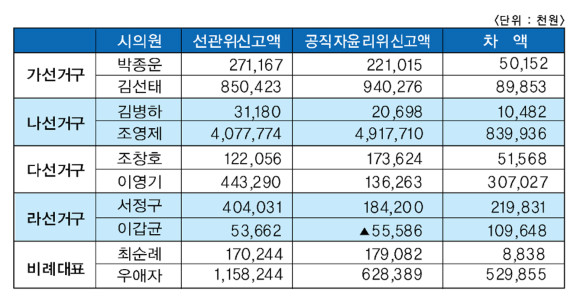 선관위 신고액 대비 공직자윤리위원회가 공개한 재산신고액이 증가한 시의원은 4명이었다.