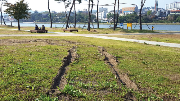 | | | ⓒ 영천시민뉴스 | | 문화예술축제가 열린 둔치에서 외지상인들이 자리한 강남쪽 둔치가 축제가 끝난 뒤 잔디위로 차가 들어가 군데군데 잔디가 심하게 훼손, 잘 가꾼 둔치 잔디가 크게 훼손됐다.