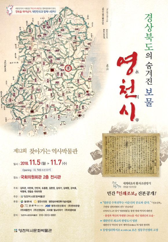 제12회 찾아가는 역사박물관 특별기획전이 오는 11월 5일부터 7일까지 3일간 국회의원회관 2층 전시실에서 열려 ‘경상북도의 숨겨진 보물, 영천시’라는 주제로 지역이 자랑하는 문화재를 선보이게 된다.