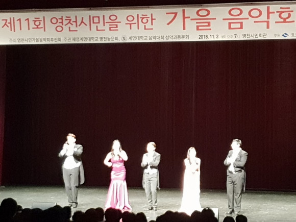 제11회 영천시민을위한 가을음악회가 지난 2일 오후 영천시민회관에서 이만희 국회의원, 최기문 시장, 박종운 시의장과 계명대학교 부총장, 이재하 계명대학교 총동창회장, 오순영 재영계명대동문회장 및 학생과 시민 등 6백여 좌석을 가득 메운 가운데 영천시민을위한 가을음악회 추진위원회 주최로 열렸다.