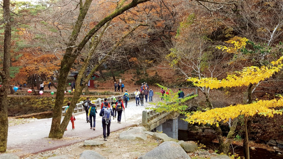 천년고찰 은해사에 막바지 단풍객들로 경내가 붐볐다. 주말인 지난 11일 은해사 일대는 단풍객들의 울긋불긋한 옷과 막바지 단풍잎이 어울려져 물감을 들인 듯 했다.