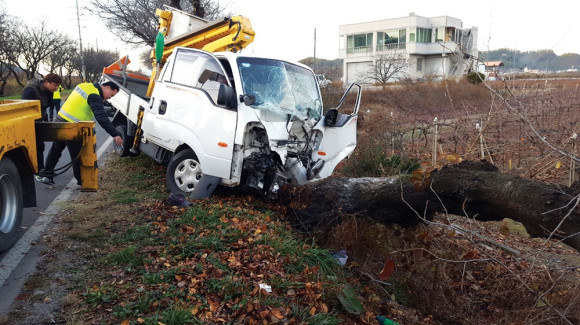 지난 11월 23일 오후 4시50분경 화룡동 화룡삼거리 위 도로에서 시내 방면으로 들어오던 1t 트럭이 중앙선을 넘어 큰 가로수를 들어 받아 가로수가 완전히 부러지고 운전자가 의식불명의 상태로 병원으로 후송됐다.