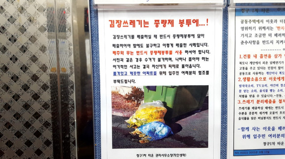 버리는 배추는 음식물이 아니라 쓰레기다. 김장쓰레기는 종량제봉투에 버려야 한다는 안내 문구가 청구아파트 입구나 엘리베이트 안에 붙어있다. 이는 청구아파트 뿐 아니라 영천시 자원순환과 등에서 수차례 고지했으나 아직 실천하지 않는 곳이 많다. 김장철 김장에 불필요한 배추나 무는 종량제 봉투에 넣어 쓰레기로 분리 배출해야 한다.