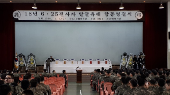 | | | ⓒ 영천시민뉴스 | | 지난 12월 5일 50사단 강철체육관에서 2018년 6·25전사자 유해발굴 합동 영결식이 있었다. 영천시 에서는 11한구의 유해를 발굴했다. 이날 영결식에는 박상대 6·25참전유공자회장과 장팔봉 전몰군경 유족회장을 비롯한 회원들이 참석했다.