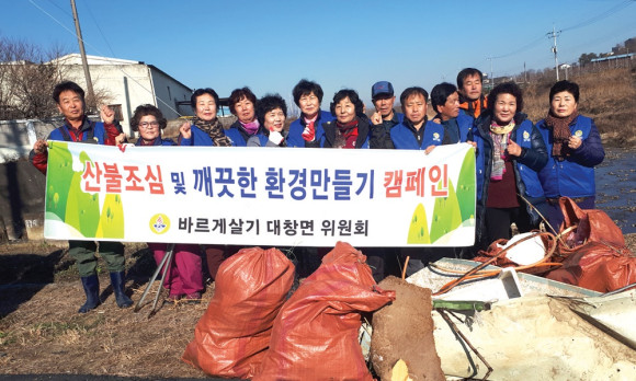 대창면 바르게살기운동협의회(회장 박태현)는 지난 14일 대창면 일원에서 환경정활활동을 펼쳤다. 이날 정화활동에는 회원 및 관계자들이 참여한 가운데 대창천 일대 및 대창면 일원에 흩어져있는 각종 오물과 쓰레기 등을 수거했다.