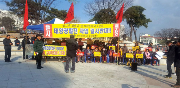| | | ⓒ 영천시민뉴스 | | 임고면 삼매리 주민들이 지난 12월 21일 영천시청 광장에서 태양광발전소 설치 결사반대를 외쳤다. 이들은 ‘청정지역 도룡뇽 수리부엉이 지켜내자’ 등의 현수막을 걸고 반대 입장을 분명히 했다. 삼매리에는 2개 업체에서 도시계획위원회 재심의중이고 1개 업체에서 시청 해당부서와 개발행위 협의 중이다.