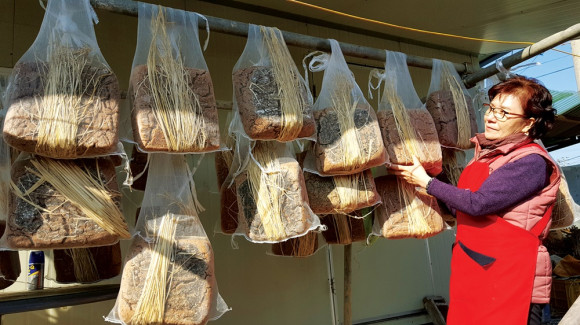 나눔의집인 ‘함께하는세상’ 메주가 탐스럽게 익어가고 있다. 메주를 말려서 장만들기까지는 수많은 공정을 거쳐야 하는데, 그 중 하나인 메주 겉말림 상태를 살펴보고 있는 자원봉사자.
