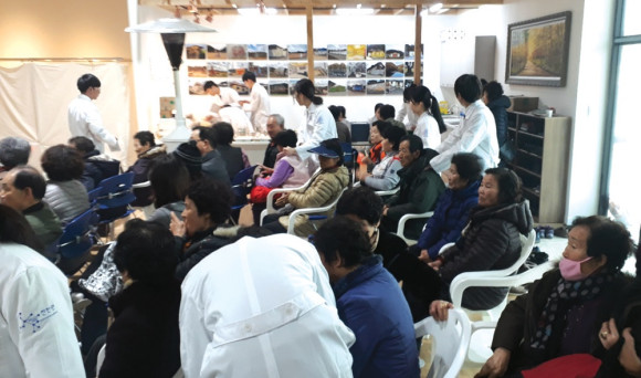 ↑↑ 동국대학교에서 화산면 어르신에게 무료 한방진료를 해 주고 있다.