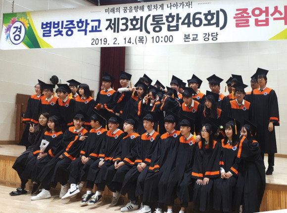 영천 별빛중학교는 지난 14일 학교 강당에서 제3회 졸업식을 거행했다(사진). 이날 졸업식에는 졸업생 39명(남 27·여 12명)과 재학생, 학부모, 내빈 등이 참석한 가운데 재학생들의 식전공연, 개식사, 졸업장 및 장학금 전달식이 진행됐다.
