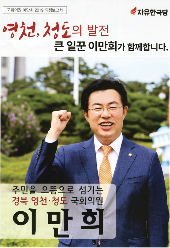 이 의원은 이날 열린 의정보고회에 앞서 ‘국회의원 이만희 2019 의정보고서’를 제작 각 세대에 우편으로 배포했다. 의정보고서에 실린 영천시 국비확보현황에는 영천~신경주 복선전철화 620억원, 영천~삼창간 국도 4차로 확장 119억원, 한국폴리텍대학 영천캠퍼스 설립 64억원, 대구선 복선전철화 60억원, 신화랑풍류체험벨트 28억원, 자양면 지방상수도공급사업 5억원, 농산어촌개발사업 45억원, 고경면 고도리 민도실 4억원, 서부 서산동 마을안길 개설 4억원, 완산지구 구역계~미소지엄2차 도로 확포장 3억원, 청통 신학리 소규모 위험시설 정비 3억원, 청통 신원리 및 용천리 교량 재가설 9억원이다.