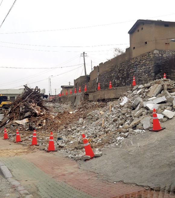 중앙동 도로확장지역 건물 철거작업이 지난달부터 시작됐는데, 건물철거시 안전시설을 하지 않아 인도로 다니는 시민들의 안전과, 바로밑 차도로 다니는 운전자들의 안전을 항상 위협하고 있다고 독자가 사진을 찍어 제보했다.