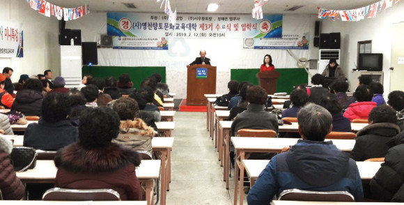 사)영천향토문화교육대학(학장 김태식)은 지난 12일 오전 교동새마을금고 강의실에서 최기문 시장 및 100명에 가까운 교육생들이 참석한 가운데 2019년 입학식 겸 2018년 수료식을 개최했다. 향토문화교육대학은 영천시 관내 어르신 교육생들로 매주 화요일 초청 강연 및 노래와 건강교육이 열린다.