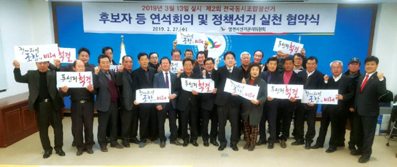제2회 전국동시조합장선거에 출마한 영천지역 후보자들이 지난 2월 27일 후보등록마감 후 영천시선관위에서 열린 정책선거 실천을 다짐하는 협약서에 서명했다. 이들은 ‘돈 선거 척결’, ‘함께 지킬 조합의 미래’ 등이 적인 피켓을 들고 공명선거 실천을 약속했다.
