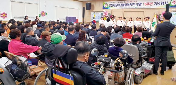 | | | ↑↑ 장애인종합복지관 개관 15주년 행사가 열리고 있다. | | ⓒ 영천시민뉴스 | | 영천시장애인종합복지관(관장 박홍열)은 지난 15일 ‘섬기는 마음으로 함께한 15년, 새로운 시작’ 이라는 슬로건을 걸고 장애인종합복지관 개관 15주년 기념행사를 개최했다.