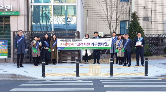 | | | ⓒ 영천시민뉴스 | | NH농협은행영천시지부(지부장 성기철)는 지난 14일 영천시청 일대에서 직원들이 함께 ‘새봄맞이 고객사랑 가두캠페인’을 실시했다. 이번 캠페인은 출근시간대에 고객들에게 꽃씨 등을 나누어 주며 감사의 마을을 전하기 위해 마련했다.