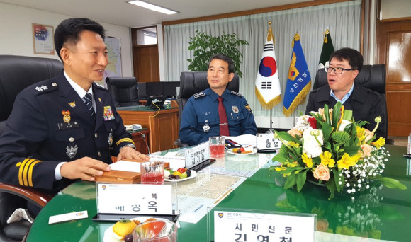 | | | ⓒ 영천시민뉴스 | | 김기출 경북지방경찰청장이 지난 19일 영천경찰서를 방문하고 기자 간담회를 가졌다. 김 청장은 “직원들과 얼굴보고 인사하고 소통하려고 왔다.”면서 “이곳은 92년 구 316 전경대 대장으로 3년간 근무하면서 누구보다 잘 안다.”고 영천과 인연을 설명했다.