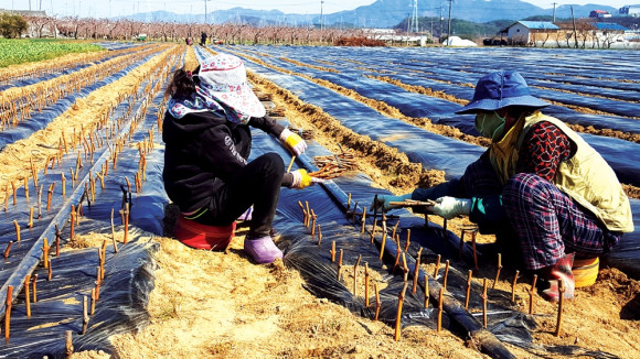 청포도 인기가 하늘을 치솟고 있는 가운데 올 가을 분양하는 청포도 묘목(삽목) 꺾꽂이 작업이 금호읍 냉천리 밭에서 한창이다. 이 밭은 5만개를 삽목하고 관리해서 가을 분양하는데, 다른 농가 등 여러 군데서 삽목을 심고 있어 가격은 올해보다 떨어질 것으로 예상하고 있으나 그래도 청포도에 대한 높은 기대심리는 꺾이지 않고 있다.