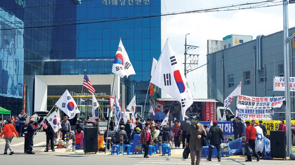 영천에서 구국태극기 집회가 열렸다. 지난 12일 오전 완산동 SD웨딩앞에서 구국총연맹영천지부(지부장 장대락) 주최로 열렸다. 이날 태극기 집회에는 일반 시민들보다 영천지부 회원들만 참여해 많은 인원이 동원된 경찰들과는 별다른 마찰이 없었다.