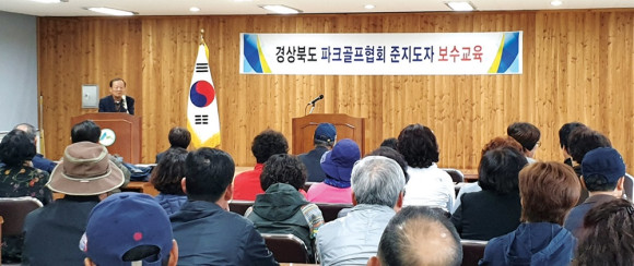 영천시 파크골프협회(회장 안종학)는 지난 11일 영천시산림조합 강당에서 영천지역 60명의 준지도자들이 참석한 가운데 준지도자 보수교육을 실시했다. 준지도자는 일정한 교육과 실기 등으로 자격이 주어지며 자격 취득시 각종 경기에서 심판 및 진행요원으로 활동한다.