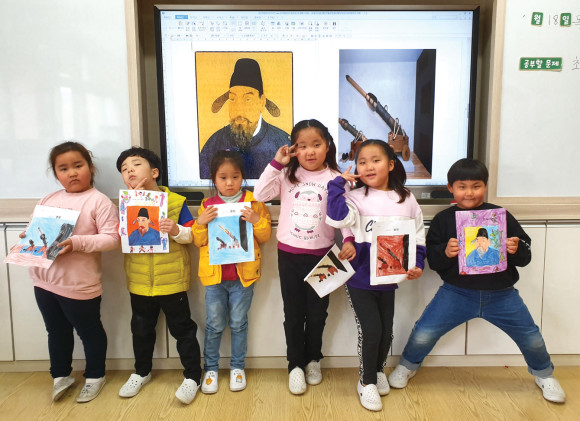 ↑↑ 자천초등학생들이 최무선 알기 활동을 하며 포즈를 취하고 있다.