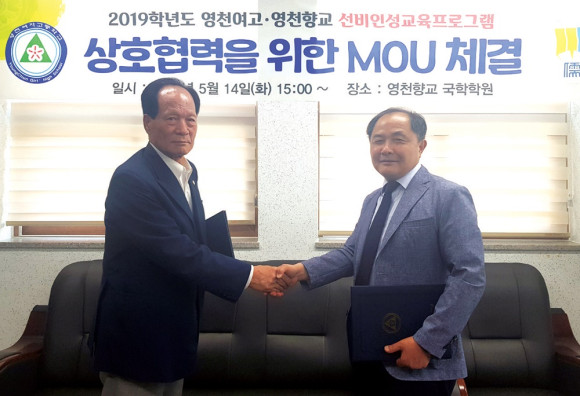 영천여자고등학교(교장 김중주)는 지난 14일 2019학년도 미래형 선비 인성교육 프로그램 운영을 위해 영천향교(전교 김달헌)와 실천중심의 인성교육프로그램 교류 협력 사업에 관한 협약(MOU)을 체결했다(사진).