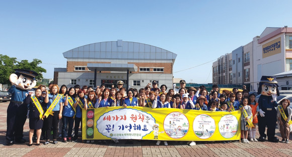 영천경찰서는 안전보행 3원칙이 적힌 어린이 교통안전과 관련된 선물을 나눠주고 ‘안전하게 횡단보도 건너기’의 안전보행 지도를 했다.