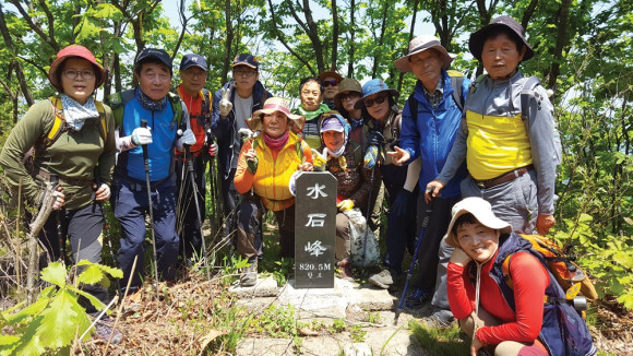 11시30분 이곳에서 점심캠프를 차렸다. 5월이라 대원들의 반찬은 어느 때 보다 나물이 많았다. 점심 후 대원들은 수석봉 앞에서 잡초제거 봉사를 했다. 수석봉 앞에 잡초가 우거져 수석봉 표석이 보이지 않을 정도다. 맨손으로 제거 활동을 했다. 수석봉은 몇 해 전 6·25전쟁 유해발굴터로 이름을 날렸다.