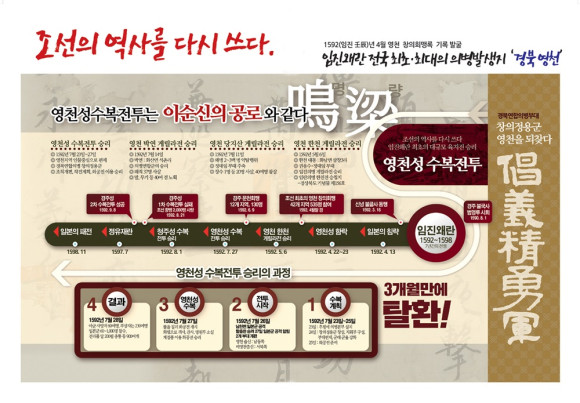 임진왜란 최초의 대규모 육지전 승리를 이끌어낸 경북연합의병부대 창의정용군의 영천성수복전투를 ‘이순신의 공로와 같다.’라고 조선왕조실록은 전하고 있으며 그 당시 병권을 맡아 임진왜란을 지휘한 병조판서 백사 이항복의 백사별집에는 ‘영천성 수복전투는 명량과 함께 최고의 전투라고 10년이 지나도 사람들의 입에서 회자된다.’는 기록을 근거로 위대한 경북의 역사임을 알리고자 하는 것이 전시회의 목적이다.
