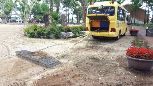 | | | ⓒ 영천시민뉴스 | | 임고초등학교의 효과적인 운동장 관리 방법이 알려졌다. 지난 16일 학교 관계자들은 통학버스 뒤편에 운동장 고르는 무거운 철망을 달고 운동장을 돌고 있는데, 이는 땅을 고르게 하는 것과 잡초 제거에도 효과적이다고 한다.