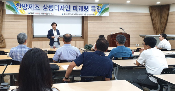 | | | ⓒ 영천시민뉴스 | | 영천한방제조가공협의회(회장 전선만)는 지난 7월 18일 농업기술센터에서 디자인특강을 개최했다. 이날 특강은 디자인 오엔의 서정미 대표가 브랜드와 상품 패키지디자인, 개발사례 영천한방제조사 상품 시장조사 브랜드 및 마케팅커뮤니케이션 전략 등에 대해 강의했고 한방제조협의회 회원과 동종업계 종사자, 관심있는 시민들이 참석했다.